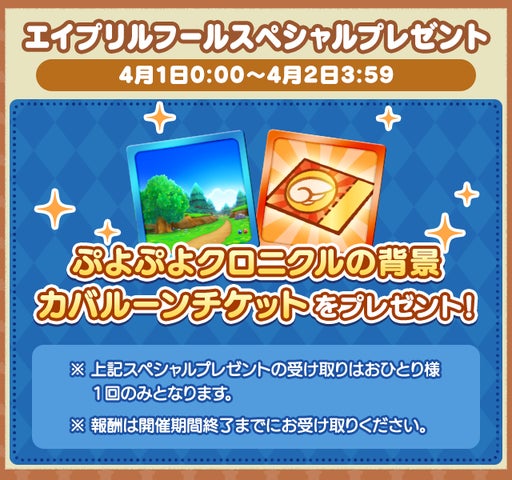 イベント内容は、1日限定の特別クエスト「かえってきた!?ぷよっとぬりけしクエスト」と、ログインで「ぷよぷよクロニクルの背景」やガチャを引けるチケットがもらえる「エイプリルフールスペシャルプレゼント」、カバルーンが必ず当たる「カバルーンチケットガチャ」です。