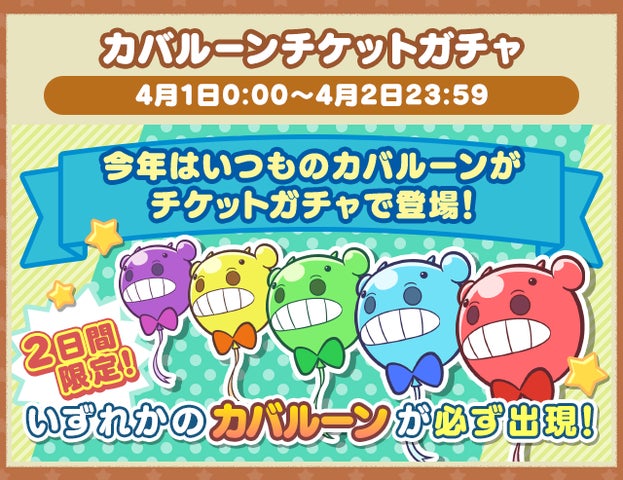 - 「かえってきた!?ぷよっとぬりけしクエスト」「エイプリルフールスペシャルプレゼント」「カバルーンチケットガチャ」など様々なイベントを実施