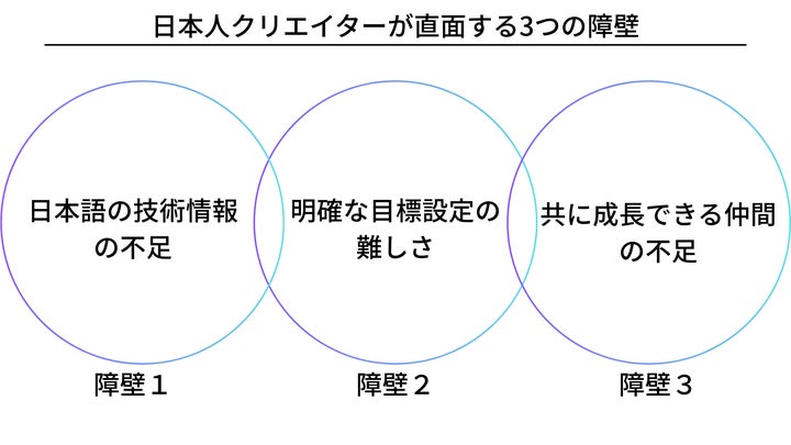- 日本人クリエイター向け課題解決(技術情報不足、目標設定、仲間不足)