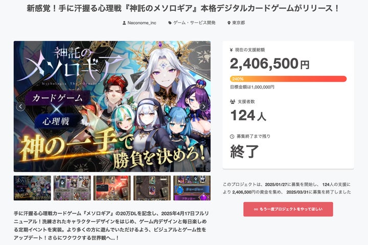 株式会社ネコノメが開発する対戦型カードゲーム『神託のメソロギア』のクラウドファンディングが、目標金額の240%、総支援者124名という大成功で終了しました。