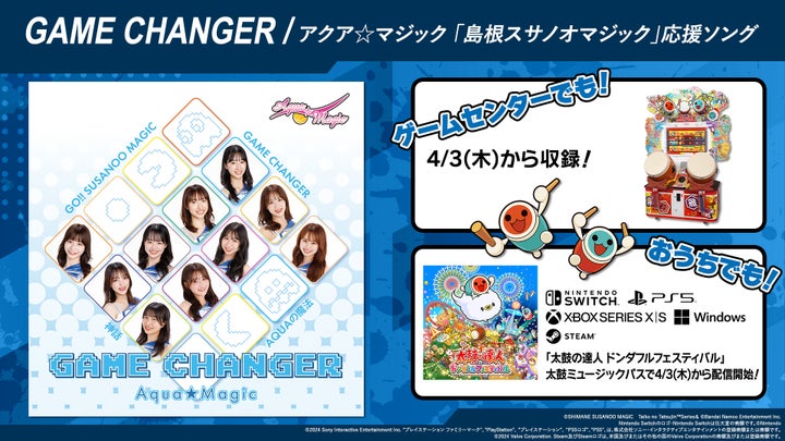 島根スサノオマジックのオフィシャルチアパフォーマンスグループ「アクア☆マジック」の最新曲「GAME CHANGER」が、2025年4月3日より『太鼓の達人 ドンダフルフェスティバル』(Nintendo Switch™/PlayStation®5/Xbox Series X|S/Windows PC/STEAM®)とゲームセンター版『太鼓の達人』で配信開始されました。