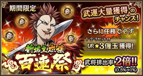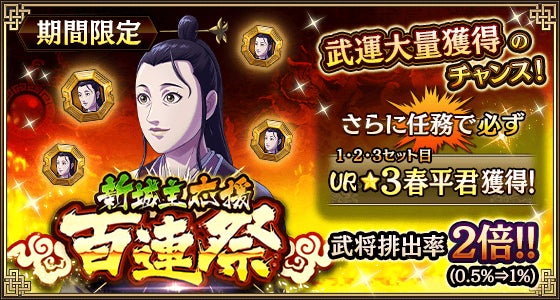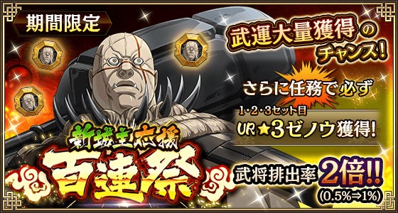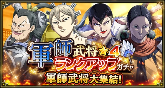 また、人気武将が排出確定の武将ガチャや、UR武将選択宝箱が獲得できるランクアップガチャなども開催。