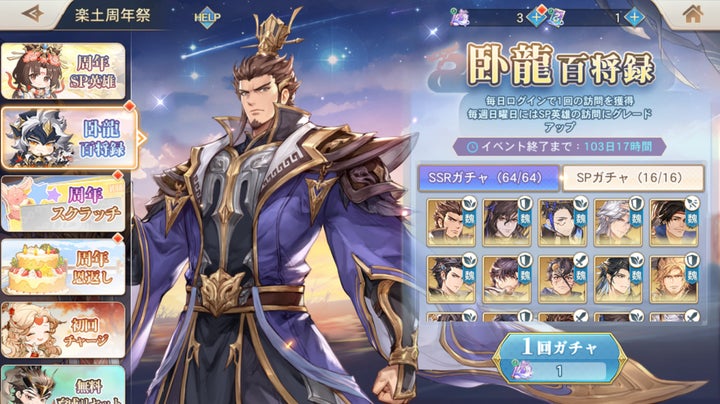 3周年イベントでは、新キャラクター「珺瑶大喬」(CV:戸松遥)が登場し、全レア度混合初心者限定ガチャや最大200連ガチャ券の無料配布、ログインイベントによるSSR64体+SP16体の無料配布など、豪華特典が盛りだくさんです。