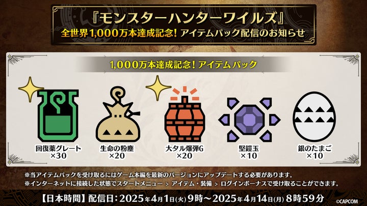 『モンスターハンターワイルズ』(PS5、Xbox Series X|S、Steam)が発売1ヶ月で1000万本を突破し、それを記念した無料タイトルアップデート第1弾が配信されました。