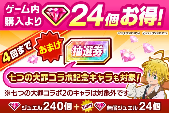 『七つの大罪コラボ』では、メリオダス、マーリンら七つの大罪メンバーが登場し、特別なキャラガチャやジュエルパックで獲得可能です。