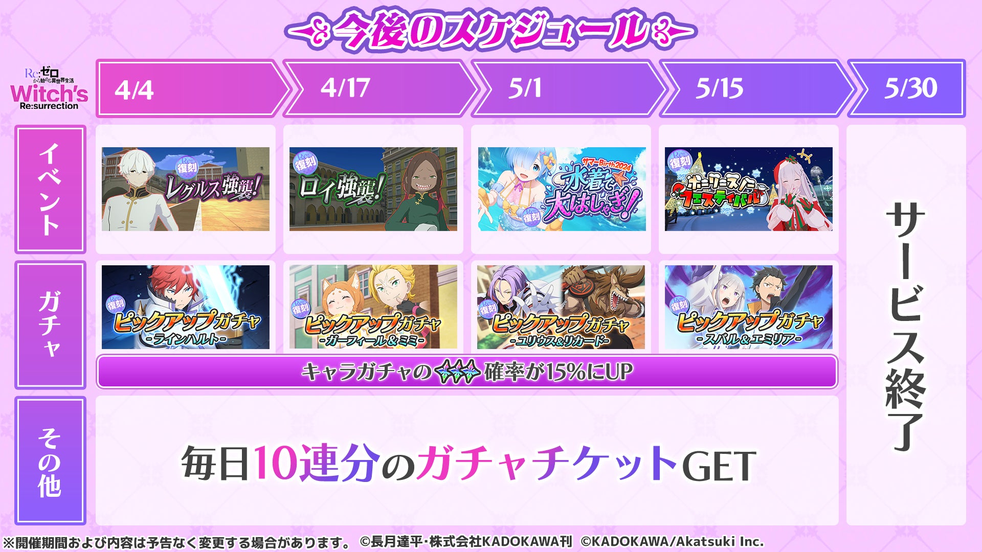株式会社KADOKAWAは、スマホゲーム『Re:ゼロから始める異世界生活 Witch’s Re:surrection』(リゼウィチ)のサービスを2025年5月30日14時に終了すると発表しました。