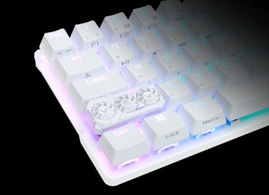 本製品は、ホワイトカラーのトリプルファン、耐久性の高い日本メーカー製ダブルボールベアリングファン、静音性に優れたリングファンブレード設計、セミファンレス対応、グラフィックボードホルダー、オリジナルメタルキーキャップといった特徴を備えています。