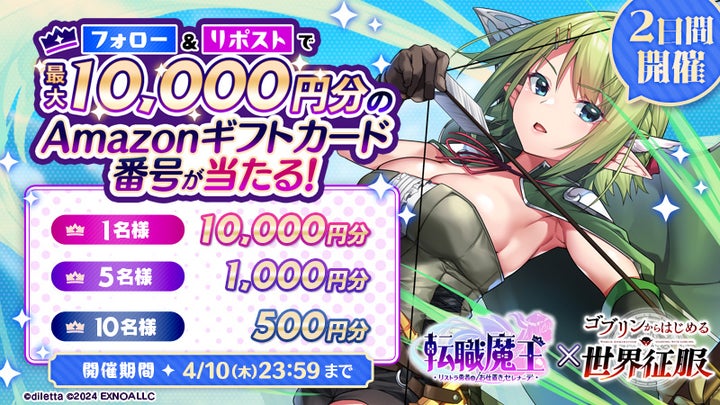 コラボイベントは2025年4月9日メンテナンス後~2025年4月23日メンテナンスまで、Amazonギフトカードキャンペーンは2025年4月9日~2025年4月10日23:59までです。