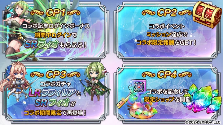 コラボ限定キャラ「【LR】ラフィリア」と「【SR】フィオ」の再登場に加え、ログインボーナスやミッションイベント、期間限定コラボガチャ、お得なアイテムセット販売を実施。