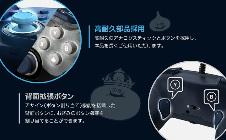 はぐれメタルのデザインだけでなく、ボタンやスティックにもスライムがあしらわれた、ドラゴンクエストファンにはたまらないアイテムです。