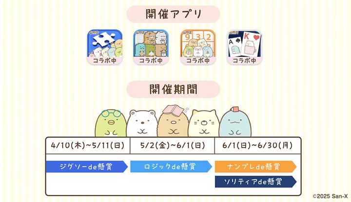 ジグソー、ロジック、ナンプレ、ソリティアde懸賞の4アプリで、すみっコぐらしデザインのパズルが登場し、クリアすると限定グッズが当たる懸賞に参加できます。