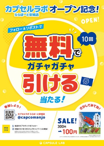 - オープン記念イベントとして、購入特典や抽選でカプセルトイ無料券プレゼントを実施