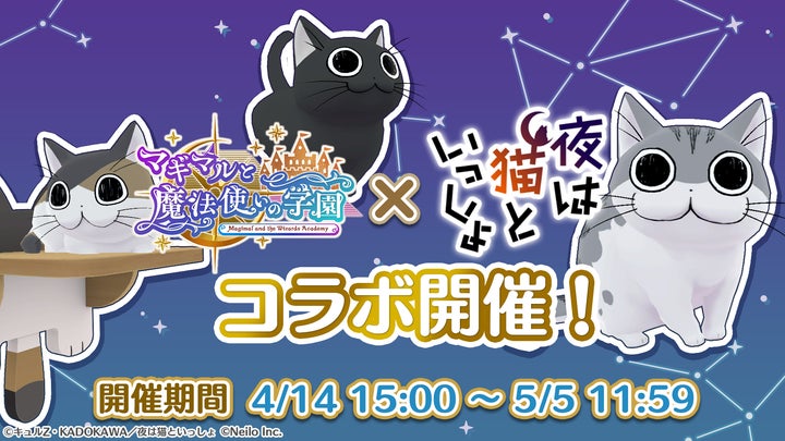 ネイロ株式会社は、スマートフォン向けアプリ『マギマルと魔法使いの学園』において、アニメ『夜は猫といっしょ』とのコラボイベントを4月14日15時より開始すると発表しました。