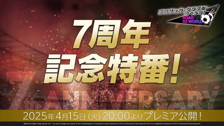 スマホ向けサッカーゲーム『プロサッカークラブをつくろう! ロード・トゥ・ワールド』(サカつくRTW)の7周年記念特番が、2025年4月15日(火)20時よりYouTubeプレミア公開で配信される。