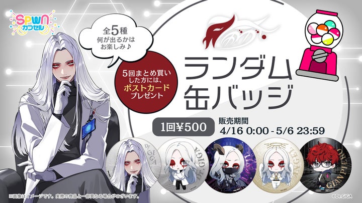 また、ランダム缶バッジはSPWNカプセルでも販売され、5回セット購入で特典のポストカードも付いてきます。