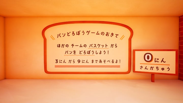 プレイヤーはパンのキャラクターになり、3チームに分かれてパンを集めるゲームで、絵本の世界観を再現したほのぼのとしたゲーム性です。