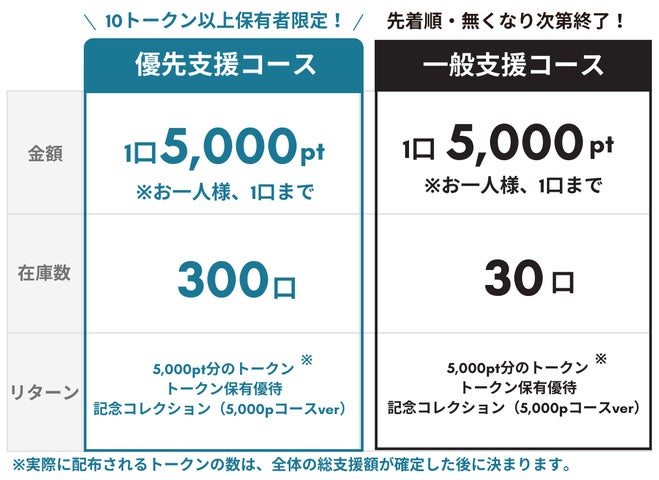 初回販売は優先支援コースと一般支援コースがあり、トークン保有者には保有数に応じた優待特典が提供予定です。