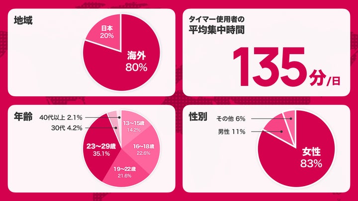 平均利用時間は135分と、作業集中アプリとして長時間利用されています。