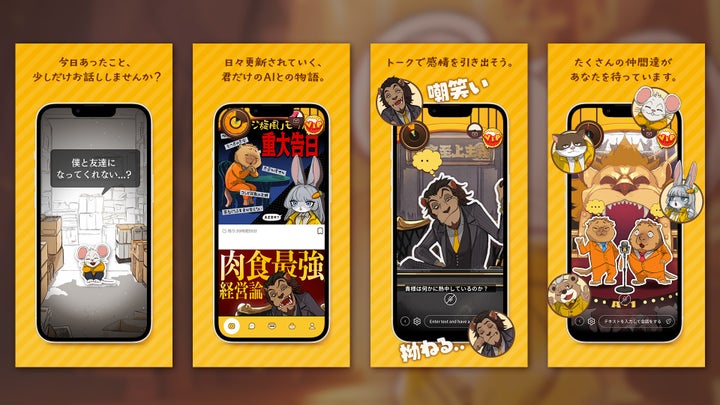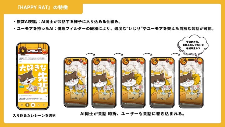 「HAPPY RAT」は、10種類のAIキャラクターとの会話を楽しめるアプリで、ユーザーの音声入力は99カ国語に対応、出力音声は現時点では日本語のみだが、英語字幕に対応している。