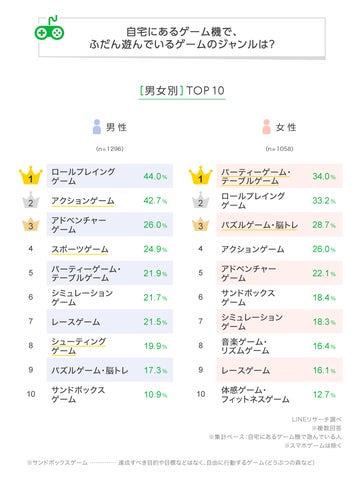 男女間では好みが異なり、男性はロールプレイングゲームとアクションゲーム、女性はパーティーゲーム・テーブルゲームとロールプレイングゲームを好む傾向が見られました。