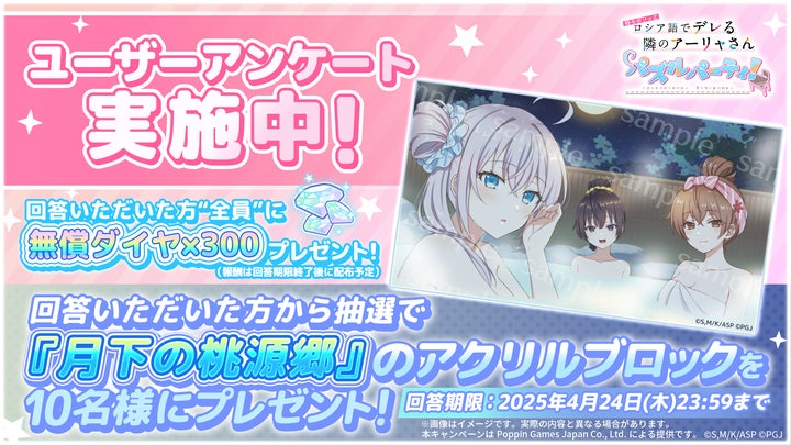 また、ユーザーアンケートも実施中で、回答者全員に無償ダイヤ300個、抽選で10名にアクリルブロックをプレゼント。