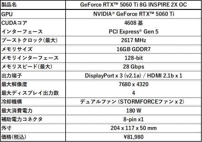 - GeForce RTX™ 5060 Ti 8G GAMING OC、GeForce RTX™ 5060 Ti 8G INSPIRE 2X OC