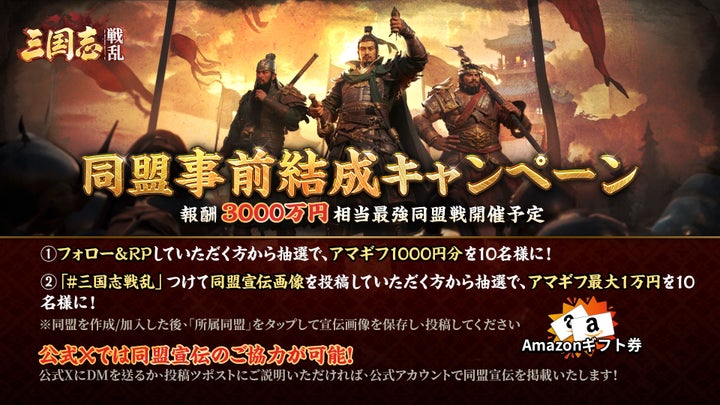 さらに、報酬総額3000万円相当の争奪戦(最強同盟争奪戦と二次創作大会)も予定されており、同盟事前結成キャンペーンも実施中です。