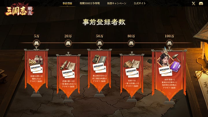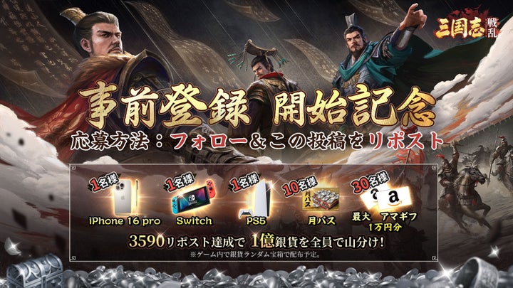 - 事前登録で豪華特典(王佐武将、ガチャなど)と報酬総額3000万円相当の争奪戦への参加権利獲得