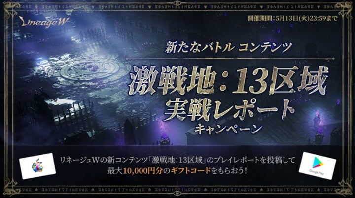 また、「激戦地:13区域」の実装を記念したキャンペーンも開催中で、プレイ感想や攻略法を投稿すると、Apple Gift CardやGoogle Play ギフトコードが当たるチャンスがあります。