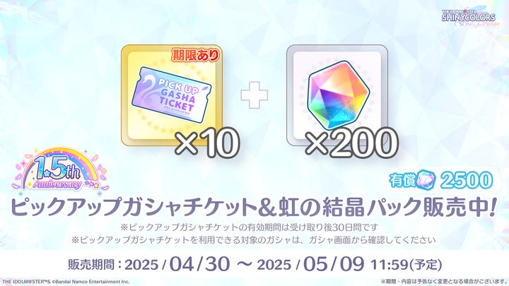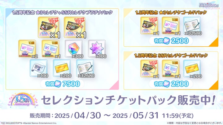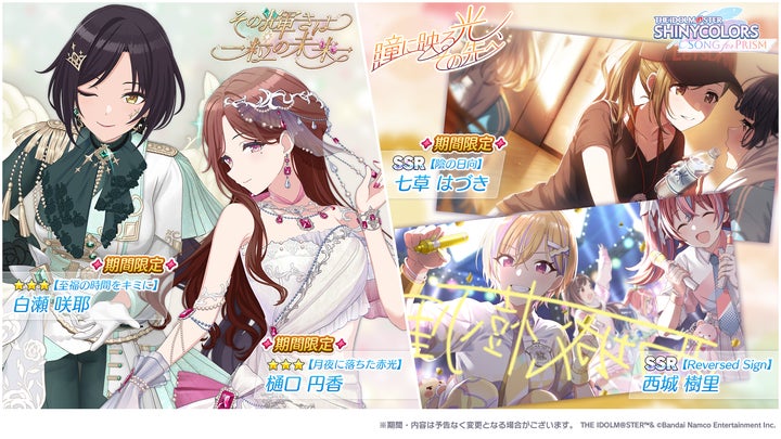 最大150連分のガシャチケットがログインボーナスで配布され、★3白瀬咲耶、★3樋口円香、SSR西城樹里、七草はづきが登場するピックアップガシャも開催。