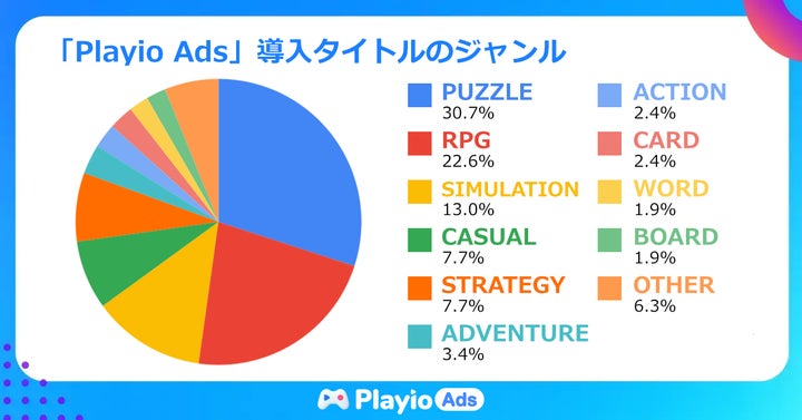 導入タイトルのジャンルは「PUZZLE」と「RPG」が全体の50%以上を占めており、これはPlayioのサービス設計と、ゲームの進行度に応じたクエスト設定によるユーザーのモチベーション維持が要因の一つです。