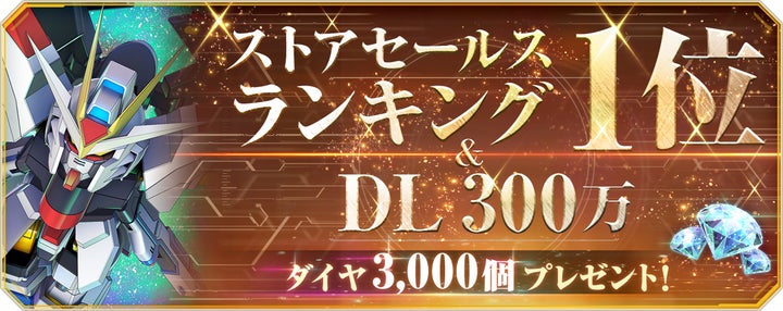 スマホ向けアプリ『SDガンダム ジージェネレーション エターナル』が全世界ダウンロード数300万件突破、一部地域でストアセールスランキング1位を獲得したことを記念し、ダイヤ3000個(ガシャ10回分)プレゼントキャンペーンが開催中です。