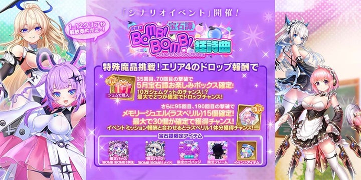 さらに、5月1日~16日には新イベント『宝石譚 今宵はBOMB!BOMB!狂詩曲』も開催され、新宝石姫クーゲルが登場するイベントストーリーや豪華報酬が用意されています。