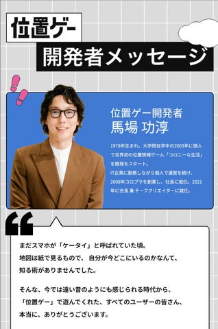 創業者・馬場功淳氏からのコメントも掲載され、位置ゲー開発への想いが語られています。