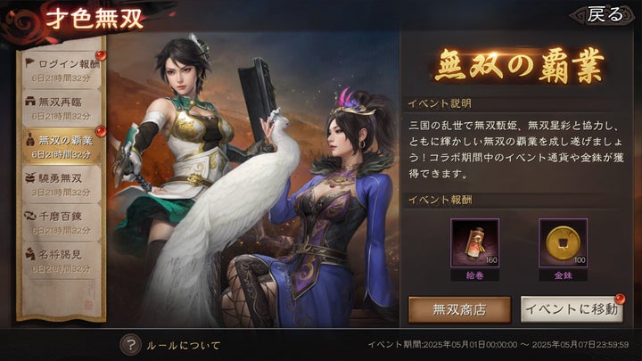 期間中は「無双の覇業」「才色兼備」「驍勇無双」「千磨百錬」「名将謁見」など複数のイベントが開催され、様々な報酬を獲得できるチャンス。