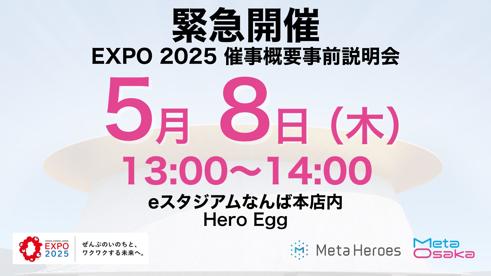 株式会社Meta Osakaと株式会社Meta Heroesは、2025年5月、EXPO2025大阪・関西万博において「メタバース・XR・AIアワード」(5/27)と「防災万博」(5/28)を開催します。