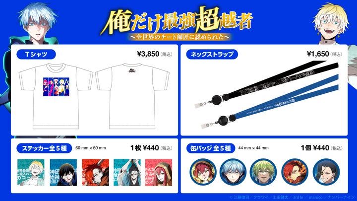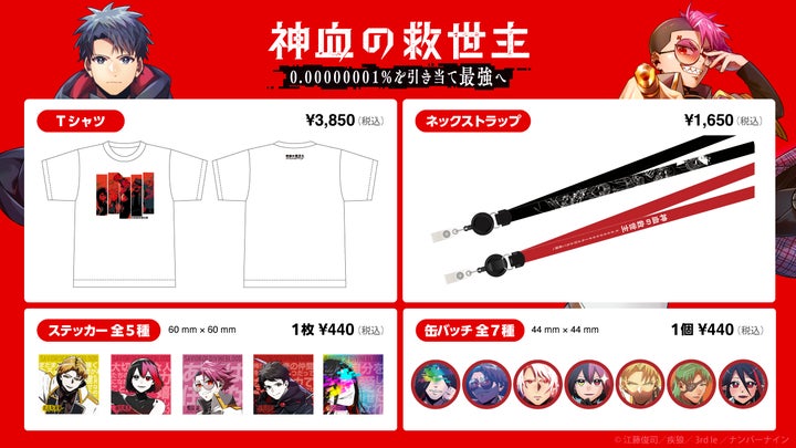 • 『神血の救世主』『俺だけ最強超越者』の公式グッズ(Tシャツ、ネックストラップ、ステッカー、缶バッジなど)を販売