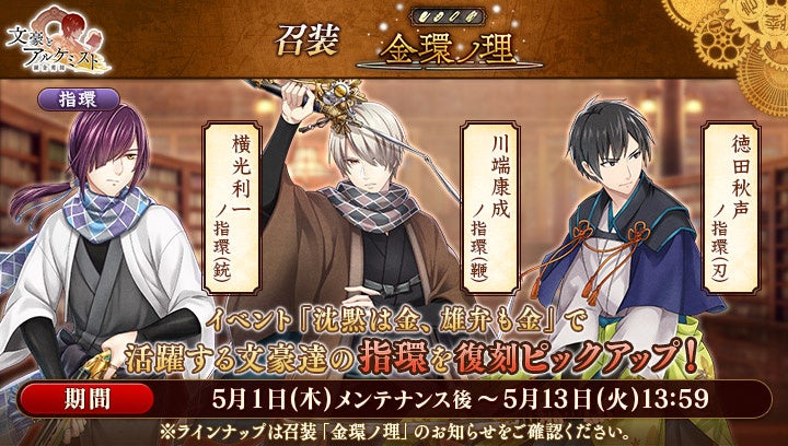 DMM GAMESの女性向け文豪転生シミュレーションゲーム『文豪とアルケミスト』において、5月1日よりイベント『調査任務「沈黙は金、雄弁も金」』と限定召装『沈黙は金、雄弁も金』が開催されました。