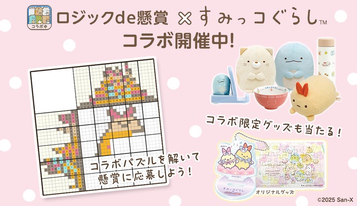 期間中は、すみっコぐらしデザインの限定イラストロジックが遊べ、コラボ限定グッズが当たる懸賞に応募できます。