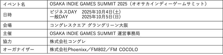 詳細情報はイベントHP(https://funky802.com/osaka-indiegames-summit)をご確認ください。