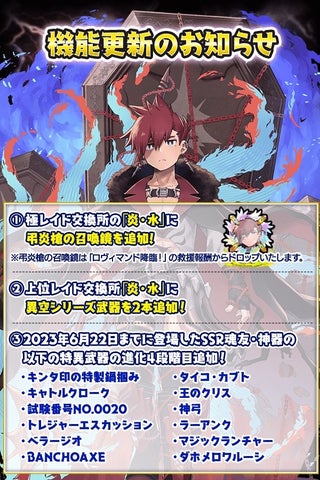 さらに、レイド機能の更新として、極レイド交換所と上位レイド交換所に新たなアイテムが追加され、2023年6月22日までに登場したSSR魂友・神器の特異武器の進化4段目が追加されます。