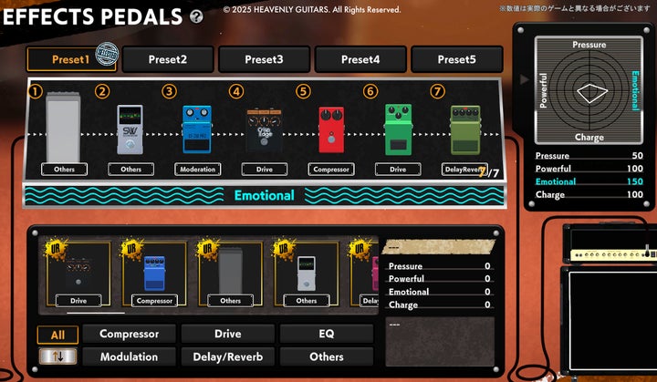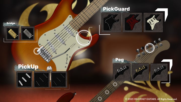 ギター、エフェクター、アンプ、アバターをカスタマイズでき、一部のギターはNFTとしてエクスポート可能です。