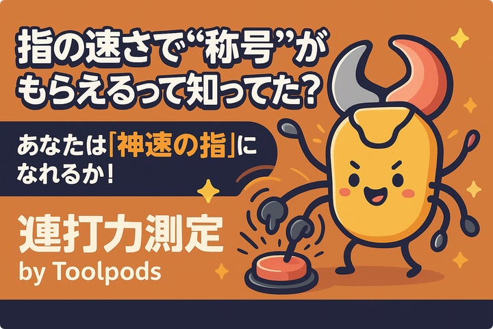 Toolpodsが提供する無料Webゲーム「連打力測定 by Toolpods」は、10秒間の連打数を測定し、「初心者」から「神速の指」までの称号を与えるゲームです。