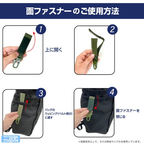 MOLLEシステム対応で、カラビナ金具と面ファスナーの2way仕様。