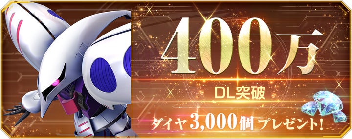 スマホ向けアプリ『SDガンダム ジージェネレーション エターナル』が全世界で400万ダウンロードを突破し、それを記念してダイヤ3000個(ガチャ10回分)が全ユーザーにプレゼントされるキャンペーンが実施されます。