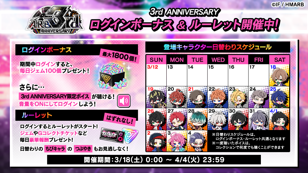 期間中、ログインすることで毎日100ジェムを獲得できるログインボーナスを実施しています。また、ログイン時にはキャラクターの3rd ANNIVERSARY限定ボイスを聴くことができます。限定ボイスは日替わりとなっていますので、どうぞお聴きのがしなく。