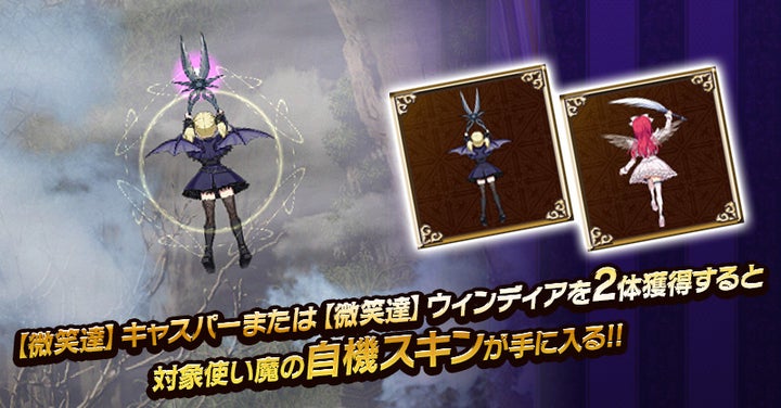コラボでは、『デススマイルズ』のウィンディア、サキュラ、キャスパー、スーピィ、レイの5人が使い魔として登場します。