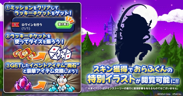 イベントではログインやミッションクリアで入手できるラッキーチケットを使ってサイコロを回し、イベントアイテム「魔石」を獲得。