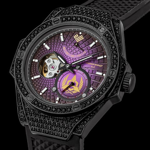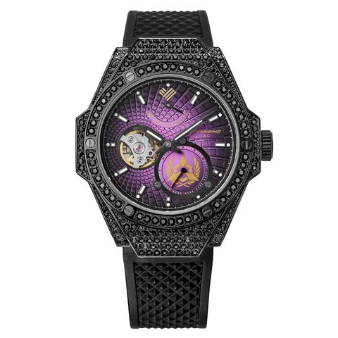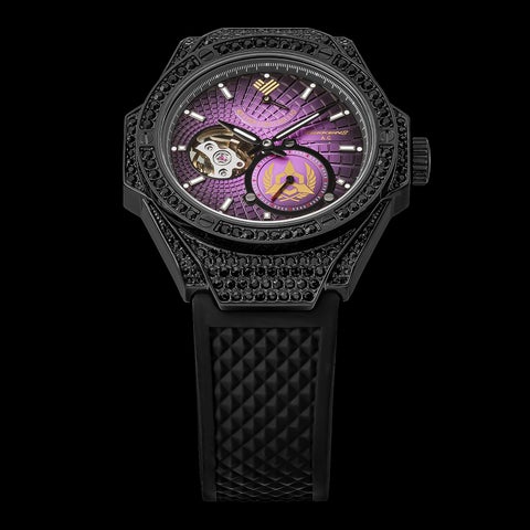 麗奈モデルは、彼女を象徴する「ミステリアス」と「二面性」を表現したデザインで、紫色のグラデーション文字盤、三島財閥ロゴ、オープンハートデザインなどが特徴です。