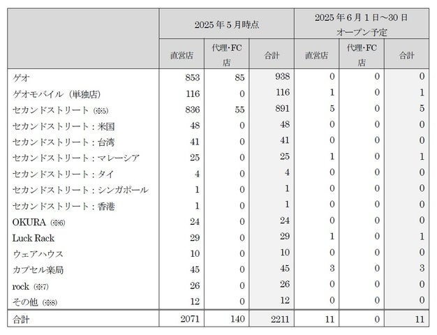 - 2025年6月に11店舗の新規出店(セカンドストリート、ゲオモバイル、ラックラック、カプセル楽局)